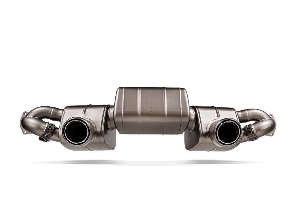 This product is constructed from high-grade titanium with a sandblasted finish. Two valves with housings made in the in-house foundry tailor the sound, providing a smooth rich tone at lower speeds, rising to a true sporty sound at higher revs. The tailpipe diameter is larger than standard stock tailpipes, with a coated outer and a cast inner shell without coating – which will react with heat to take on an attractive blue colour. Each tailpipe has a laser-engraved Akrapovič logo.