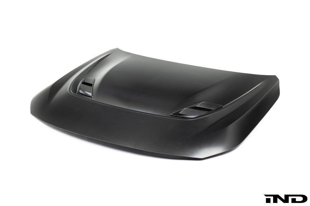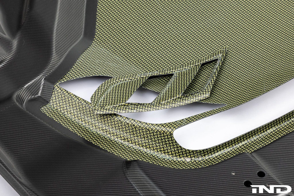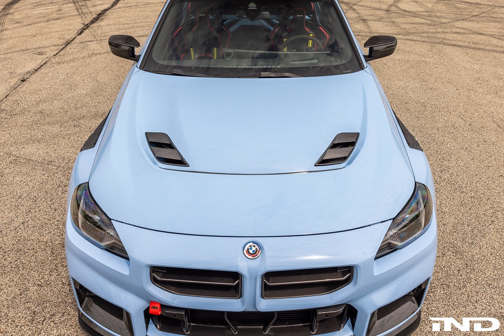 The new Clubsport version of their carbon vented hood for the G87 M2 takes performance up a notch by adding 2 additional carbon fiber cooling vents (included) that flank the power dome. As the non-clubsport hood, it is made entirely of carbon fiber with an additional layer Kevlar on the inside, which serves the stability. Taking some queues from their F87 GTS carbon hood and BMW's F87 M2 CS, this vented carbon hood weighs 19 lbs, down 7.5lbs from the factory.