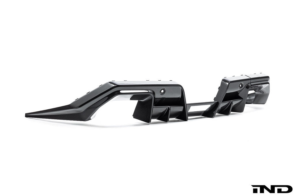 Alpha-N's V2 carbon rear diffuser for the G90 M5 or G99 M5 Touring is significantly more aggressive and functional vs the more OE-styled V1 piece. Featuring add-on integrated 'underbody floor styled' sections around the center of the diffuser, the V2 carbon piece both increases downforce and reduces drag vs the V1 variant.