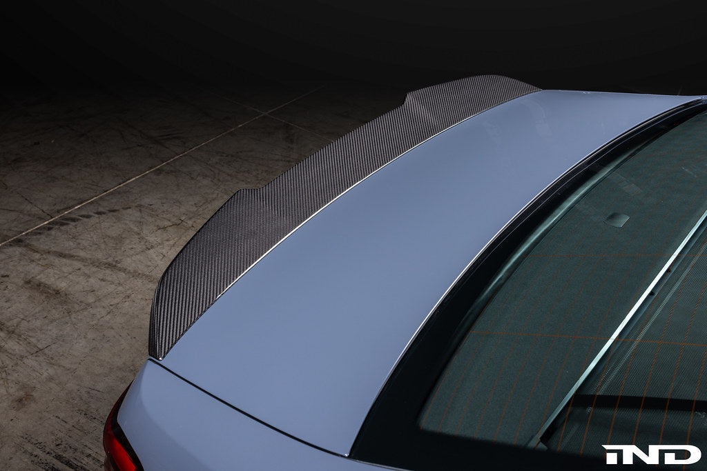 The Alpha-N G90 M5 sedan carbon rear trunk spoiler is designed to deliver superior aerodynamic performance and a sleek, sporty look. This spoiler lip not only enhances your vehicle's appearance but also provides functional benefits by reducing lift and increasing stability at high speeds.