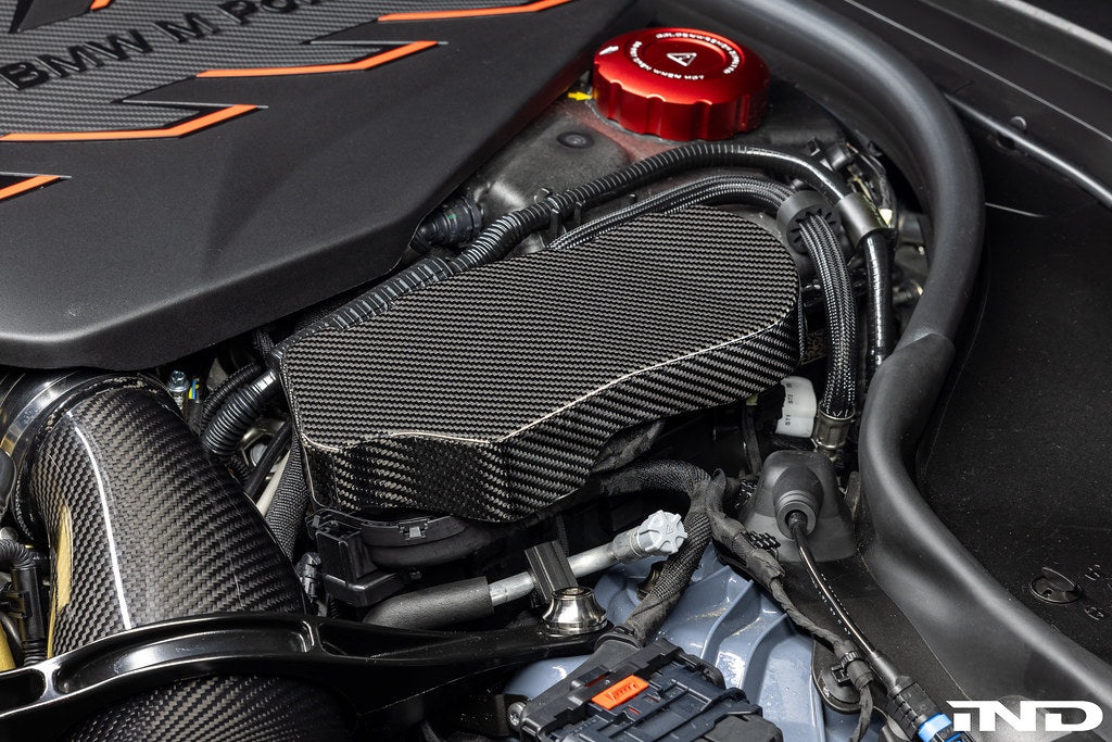 The AutoTecknic Carbon Engine Cover Extension Set includes the left carbon cover and right carbon cover, providing a comprehensive carbon upgrade that complements the M5’s powerful engineering. Whether you’re refining your M5’s under-the-hood aesthetics or showcasing it at an event, this extension set delivers a sleek, aggressive, and track-ready appearance. Experience the pinnacle of carbon fiber craftsmanship with AutoTecknic’s precision-designed components.