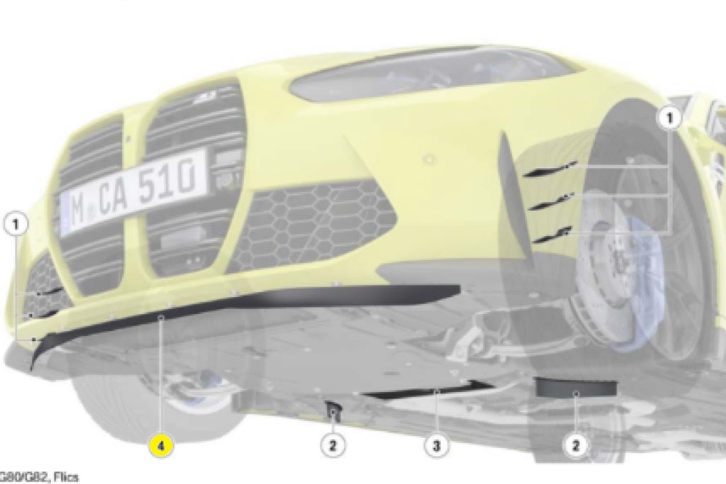 Part of BMW's Euro-only Aero Program for the G8X M2, M3, and M4. This front lip spoiler acts as a lower air dam, creating negative pressure to increase oil cooler efficiency. In addition, the design of the outer skirt areas are deeper in order to provide an even stronger negative pressure that increases downforce on the vehicle's front axle and directs airflow around the front wheels, reducing drag.