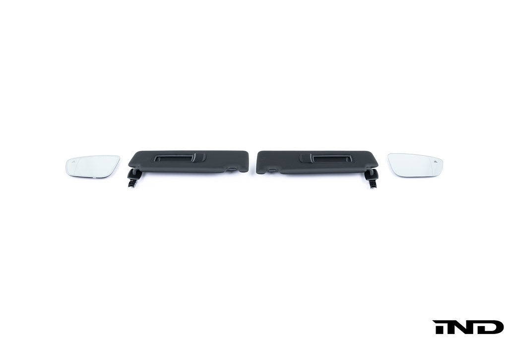 All European spec G8X M2 / M3 / M4's come with a couple of notable improvements over their U.S. counterparts. First, the European sun visor set, available in cloth fabric, is absent of any annoying warning labels. The result is a clean sun visor that is free of distractions and matches your M's interior perfectly. Next are the aspherical side mirror glass that eliminate the rather large blind spots that U.S. drivers contend with on a daily basis.