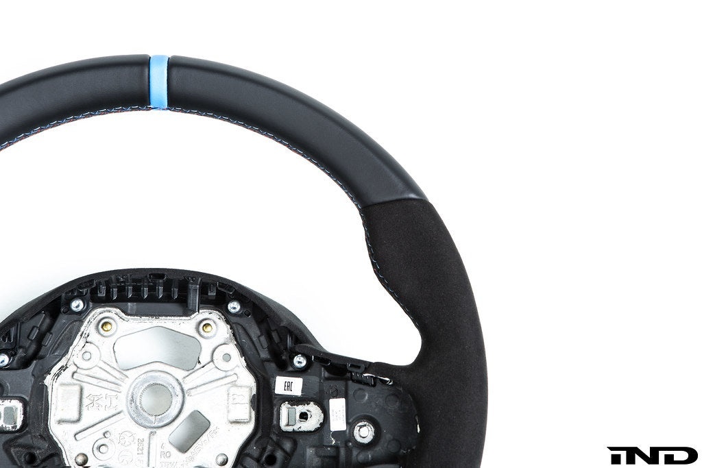 The G8X M Performance steering wheel is characterized by the use of the Alcantara, common in motor racing not least due to its grip properties. Therefore, the pronounced Alcantara gripping area with large thumb rests offers the driver maximum grip and a highly direct steering feel. Further motorsport-inspired features include the blue center marker in the 12 o’clock position and a handstitched M seam finished in M colors. To complement the Alcantara and Leather covered steering wheel surface, the optional M Performance steering wheel trims in Carbon/Alcantara and Carbon/Leather each with M Performance lettering are available to suit your preferred style. Contact our sales team for custom upholstery options.