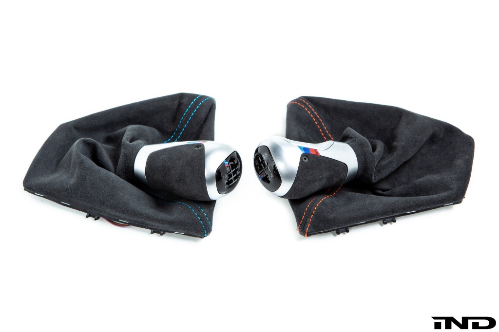 The F87 M2 M Performance shift knob has polar blue stitching on the shift boot to match the stitching throughout the M2's interior, as well as having ///M tricolor stripes on the side of the knob. The combination of Alcantara, in addition to the smooth and rough textured aluminum surfaces throughout provide superior feel when shifting between gears. The knob comes with the necessary hardware to add a lighted shift pattern feature. The kit also includes the BMW M Performance Matte Carbon Emergency Brake Lever Handle.