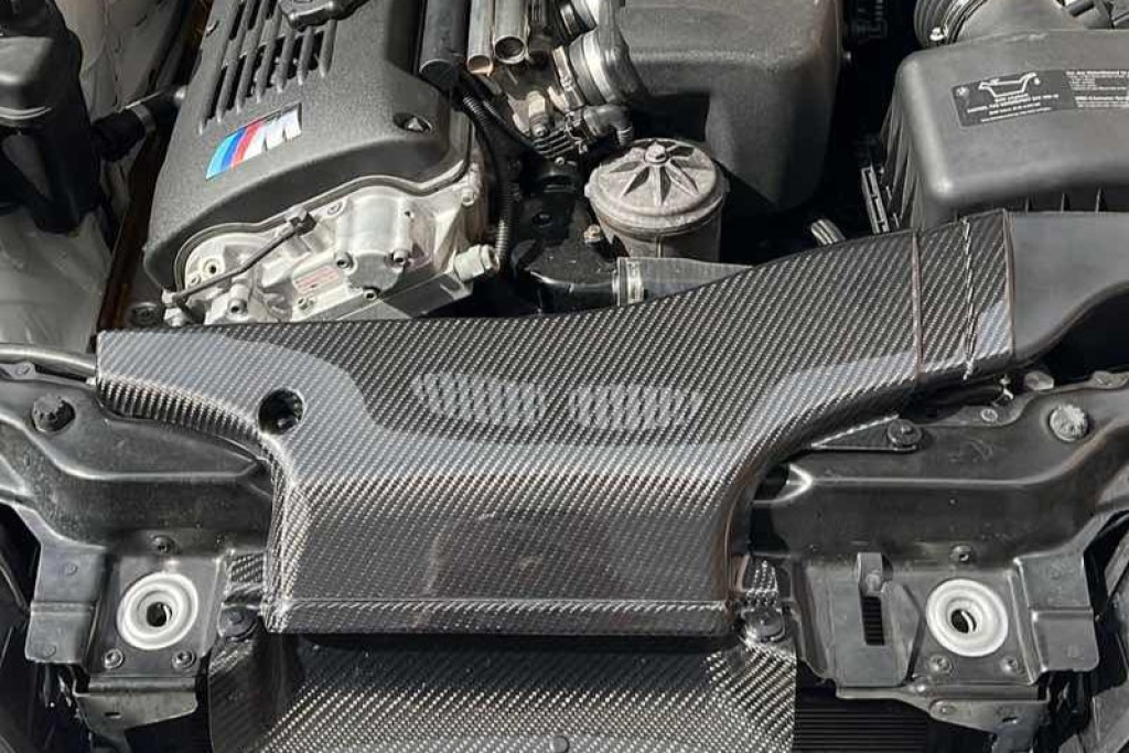 Developed as a carbon fiber reinterpretation of the original BMW E46 M3 'intake suction hood,' the Burkhart Engineering front air duct delivers on complete lightweight carbon fiber construction. This component channels fresh air from the front kidney grilles directly into the factory intake system or towards the CSL airbox. Unlike other similar products that reuse the factory air duct with a thin carbon overlay applied, Burkhart's unit completely replaces the factory heavy plastic duct with a stronger, and much lighter carbon fiber version.