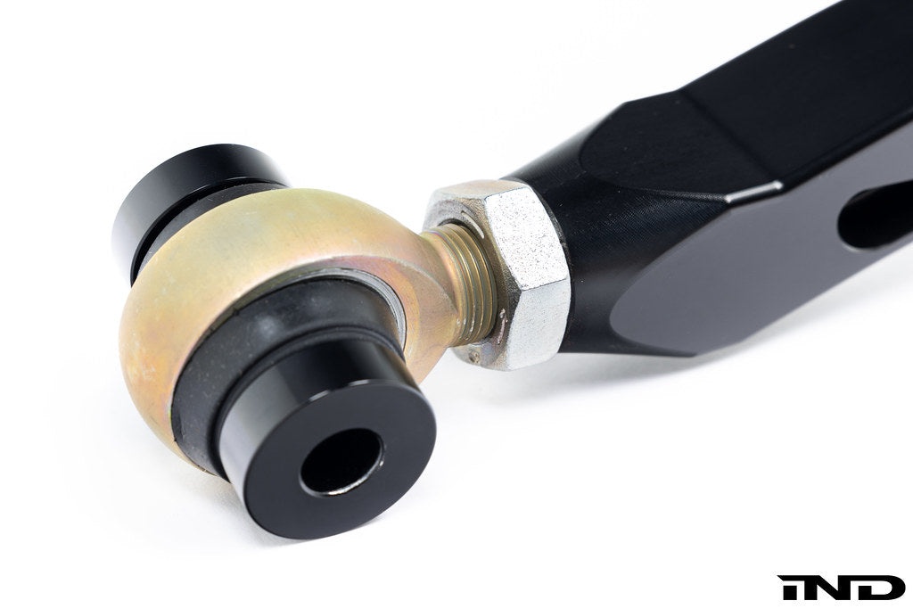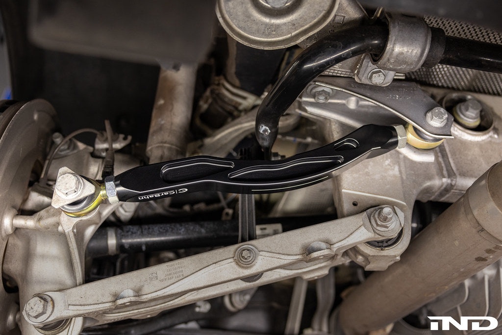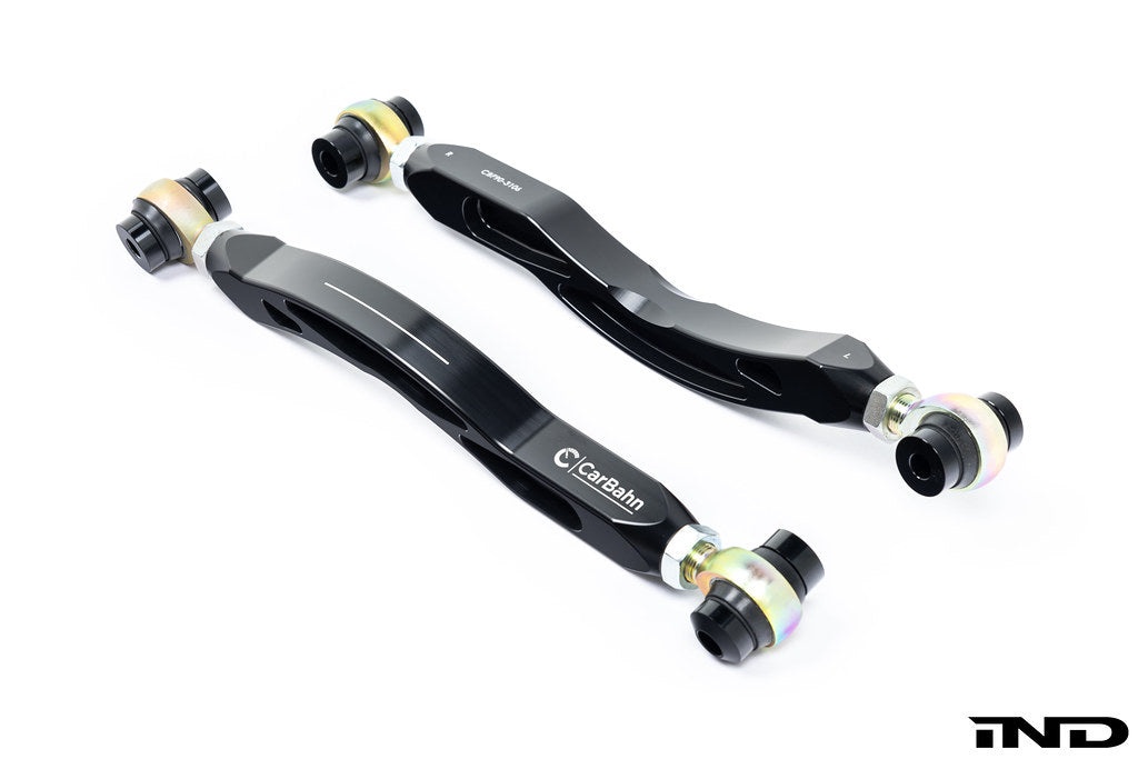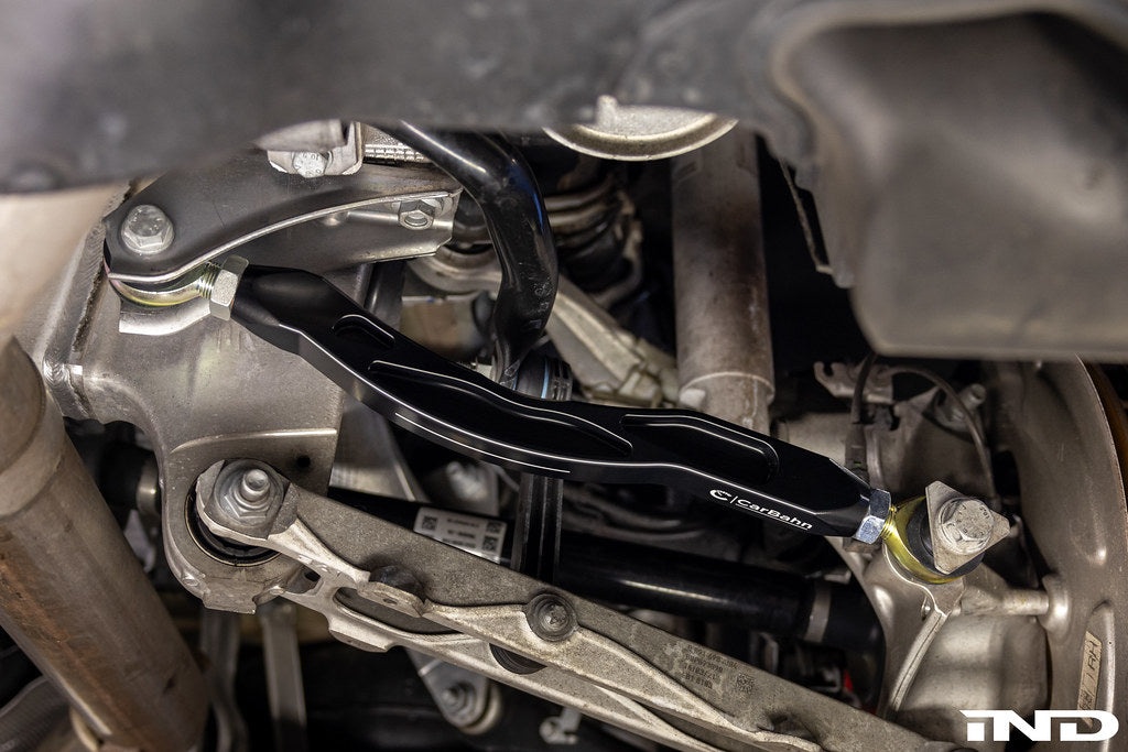 The stock rear toe link is built with rubber bushings and a curved forged alloy rod which can easily flex. During hard acceleration, this flex allows the rear wheels to have excessive toe changes. All this flex in the stock toe link causes the car to be unstable when pushing the limits of acceleration. CarBahn eliminates this flex by replacing the rubber bushings with Teflon coated machined steel rod ends, and the OEM curved bar with a straight billet aluminum rod. Most, if not all, of our competitors’ products wrap the rod end in a loose rubber boot, which not only allows water and debris to enter but also retains them which results in excessive noise and a short service life until the rod ends must be replaced. The CarBahn rod ends are sealed perfectly against water and environmental contamination, thus providing a long, quiet, maintenance-free service life.