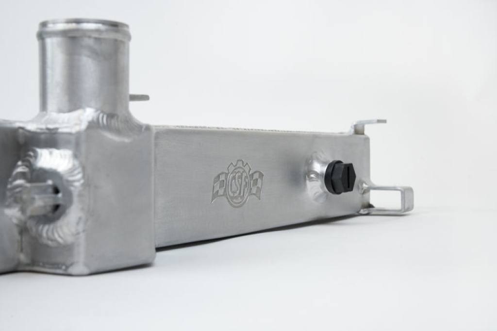 Because the S54 requires a much more robust oil cooling system than the E36's S52 or E30's S14, CSF made special provisions to fit two different race spec oil coolers. To do this, the height of the radiator was reduced slightly so the oil coolers can fit under it in a factory style location. The radiator includes mounting brackets which can be adjusted to fit both oil coolers (CSF #8032 & #8240). CSF also includes brackets for an electric fan conversion. These brackets are designed to fit a single 16 inch SPAL Fan (not included). While it is possible to retain a clutch type fan, it is much easier to convert to an electric fan on top of the performance benefits.