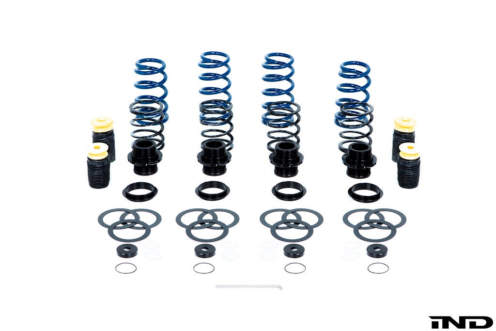 + Up to 2' of lowering in front and 2-1/8' of lowering in back are possible depending on tire clearance but with diminished ride quality. Dinan recommends a 1' drop in front and a 1-1/8' drop in the rear to maintain a civilized ride.