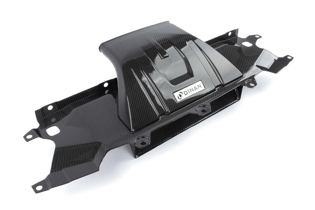 With gloss UV coated carbon fiber stretching from the front of the engine compartment to the rear it's hard not to be impressed by the sheer volume of carbon. The majority of it comprised of a fully functional secondary air inlet which doubles as an ornate engine cover. As such, signature BMW engine cover design elements signifying the cylinder count are integrated into the design for factory like continuity and a nod to a long history. The cosmetic beauty of the system does not solely derive from the presence of carbon however. The immense central passage also purposefully bisects the engine compartment to ensure the factory bracing, which is impressive on its own, is visible. With both OEM and Dinan elements showcased simultaneously the overall engine bay retains symmetrical harmony and commands attention at all corners.