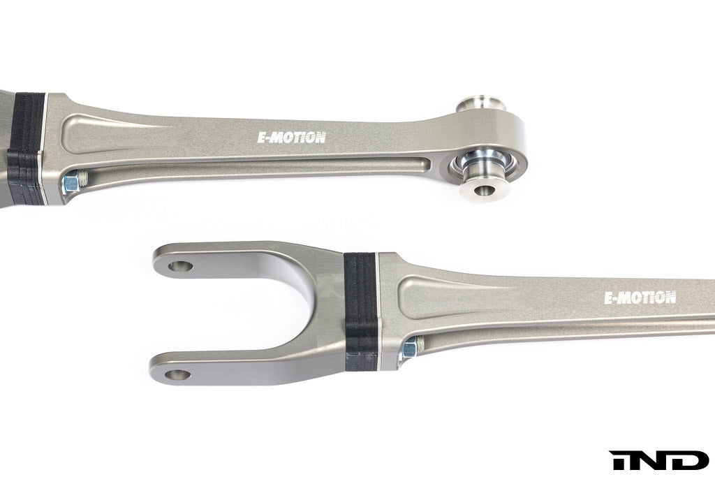 E-Motion Front Tension Arms are machined from billet 6061 aluminum and finished with mil-spec hard anodizing. Utilizing spherical aurora bearings and anti-corrosion treated studs. Built to perform and built to last. Sold in pairs.