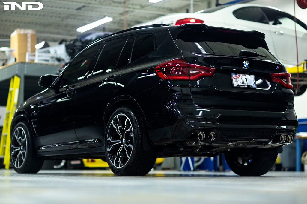 This standard has been rewritten once again with Eisenmann’s newest offering: the F97 X3M exhaust. Whereas the outgoing F85 X5M was characterized by its wide array of choices, Eisenmann engineers went the route of simplicity for the newest M SUV; the X3M will boast a 304 stainless steel race exhaust exclusively, a system specifically designed to maximize power output and exhaust note while also shedding perceivable exhaust weight. To achieve this, the original BMW muffler and valve control are deleted in favor of one, compact high-flow resonator. This allows Eisenmann to focus its efforts on the all-important task of tuning the exhaust note while minimizing restriction.