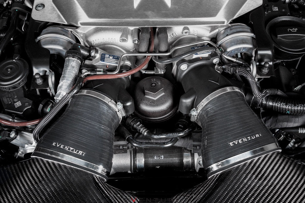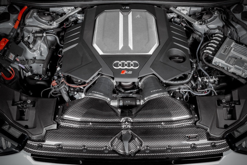 The Audi C8 RS6 intake system is the culmination of extensive development, testing and prototyping. Our aim was to address 2 main criteria: 1) Increased flow rate. 2) Smooth Airflow. The first objective was met by utilizing all of the limited space available in the RS6 engine bay which was heavily restricted by the underside of the hood. Our solution was to completely redesign the entire airbox which maximized volume, increased flow entry openings and created a more favorable filter angle to the turbos. Furthermore we dramatically increased the size of the turbo inlets by as much as 85% when measuring the cross sectional area at the openings. The second objective was met by designing an organically shaped system with a custom rounded panel filter to ensure the airflow path contained no sharp corners and therefore allowed for the flow to remain laminar. With smooth transitions from the filter to the turbo inlets, our intake minimizes the formation of turbulence and therefore the turbos are able to operate more efficiently. We partnered with BMC for a bespoke filter element to ensure that the filtration area is as large as possible whilst keeping airflow clean.