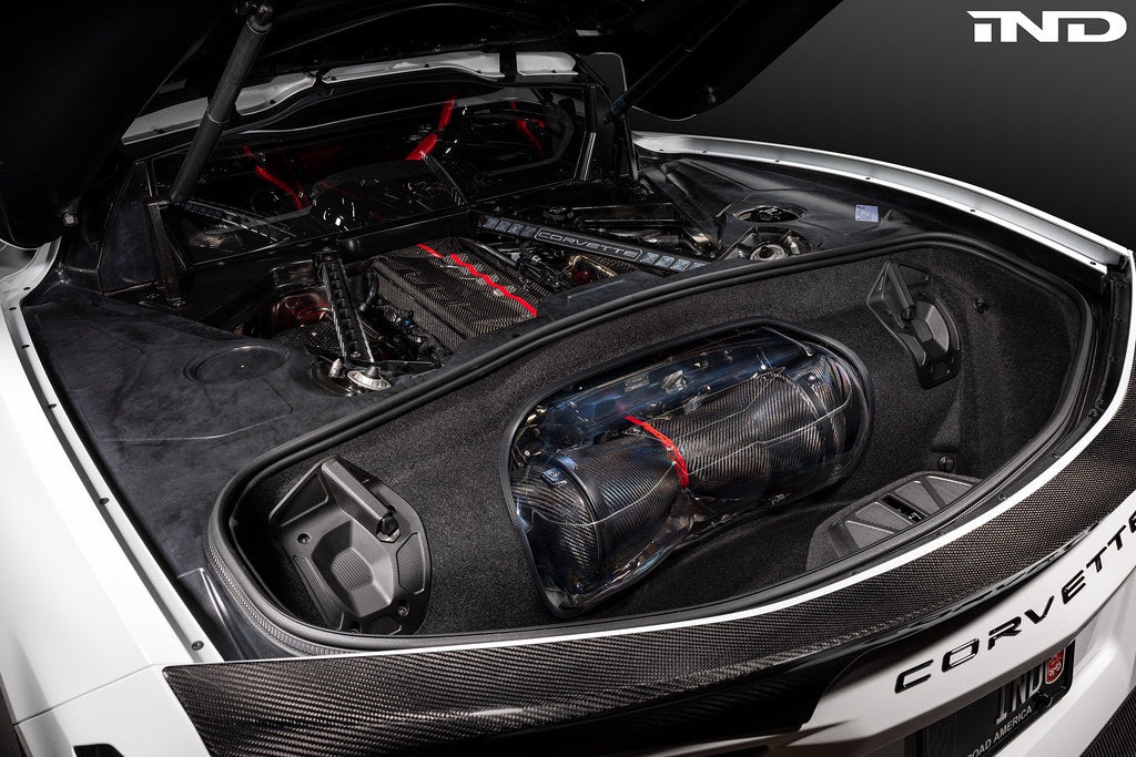 The C8 Corvette Eventuri intake included a significant advancement in intake design, setting a new standard for performance and innovation within this platform. By reimagining the intake without the confines of the OEM trunk panel, an innovative feature showcased the carbon intake system via a clear polycarbonate trunk panel to allowed direct viewing.