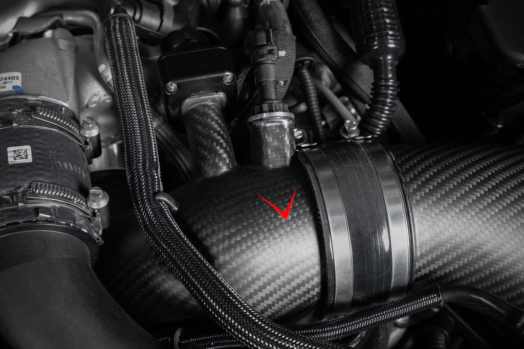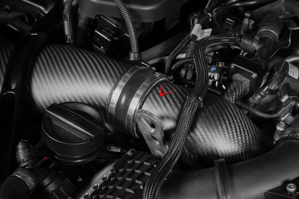 Presenting the perfect addition to our G9X M5 intake system to optimize the flow path all the way to the turbos. The OEM inlets exhibit a reduction in diameter immediately downstream of the intake connection, which can restrict airflow, particularly at elevated boost pressures. Our carbon fiber inlets address this restriction by maintaining a consistent, larger cross-sectional area and therefore there is a larger captured volume of air directly in front of the turbos. Furthermore, the curvature of the inlets has been optimized to minimize flow resistance, promoting smoother airflow to the turbochargers. Made from prepreg carbon fiber with CNC machined flanges, the inlets also provide an aesthetic improvement to the engine bay.