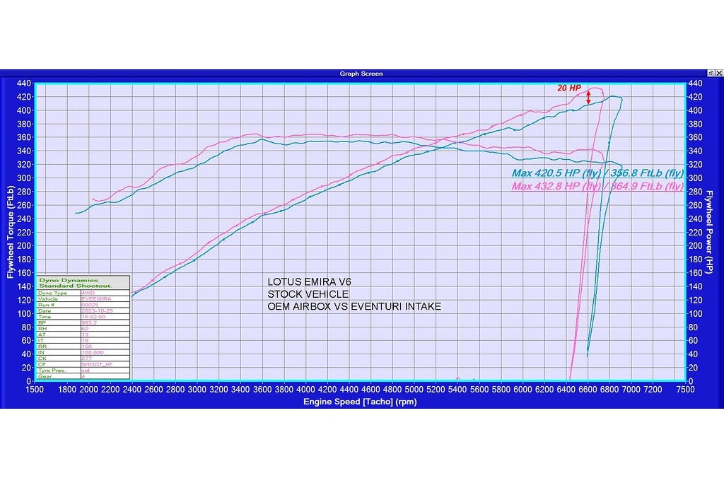 This intake has been independently dyno tested by Dream Automotive in the UK. Tests were done back to back against the stock airbox and several runs were taken with each configuration. The car tested was without charcoal filters in the stock airboxes. The dyno results show a consistent gain throughout the entire RPM range which can be attributed to the supercharger working with less resistance due to the higher efficiency of the intake system. The performance gain translates on the road to increased part throttle and full throttle response with the car pulling much more eagerly to the redline.