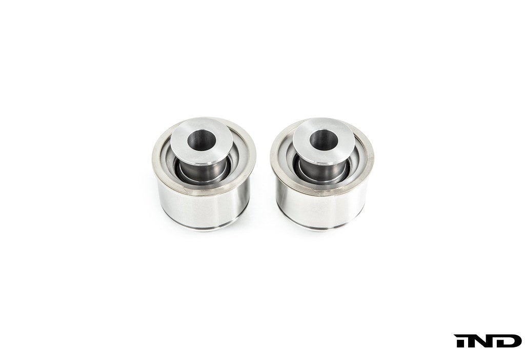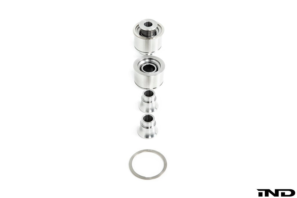 Rubber bushings found in the latest M Cars' rear camber arms are the last weak link in an otherwise rigid suspension. Fall-Line's new lower control arm bearings yield a significant improvement over the factory bushings; as motorsport parts, both strength and longevity were priorities—to do just that, Fall-Line boasts the largest FK spherical bearings on the market—by eliminating rubber from a critical feedback area of the car, you gain control over the tire’s behavior and thereby confidence behind the wheel at the limit. To adequately cope with competition-level load, Fall-Line bearings feature stainless steel spiral locks that offer 360 degrees of clamping force to secure the bearing from any potential movement.