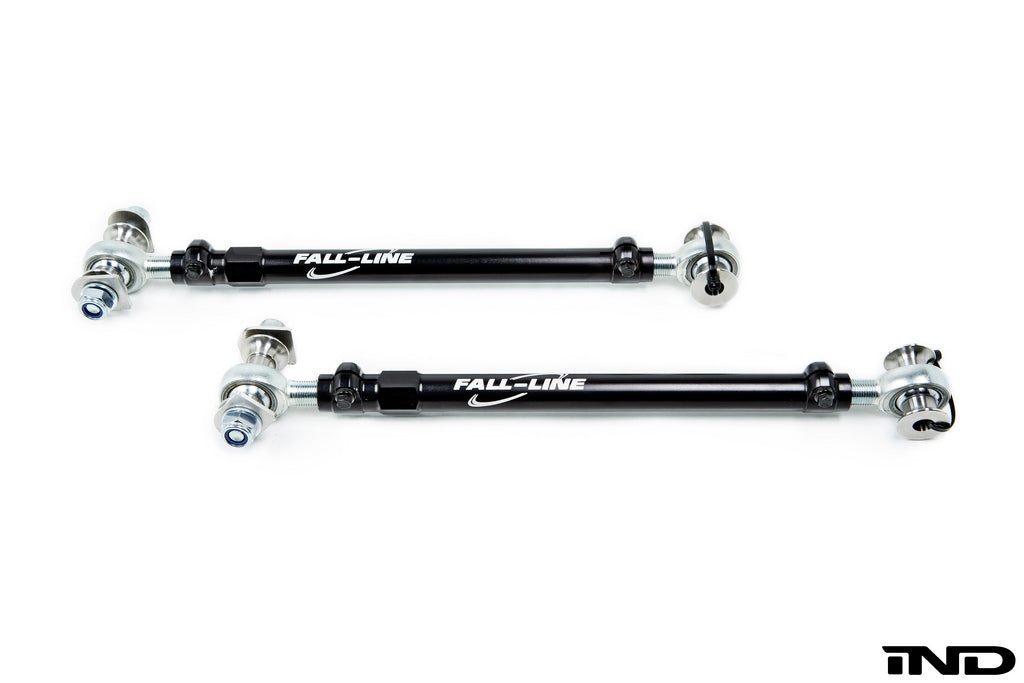 The race toe link kit by Fall Line Motorsports is designed to facilitate rapid adjustments of toe during an alignment, and combined with the tension strut will also enable adjustment of overall track. Not only does this allow for fine tuning of wheel fitment, these arms will allow an alignment shop to make quick work of car setup, even simplifying the camber adjustment process as a result.