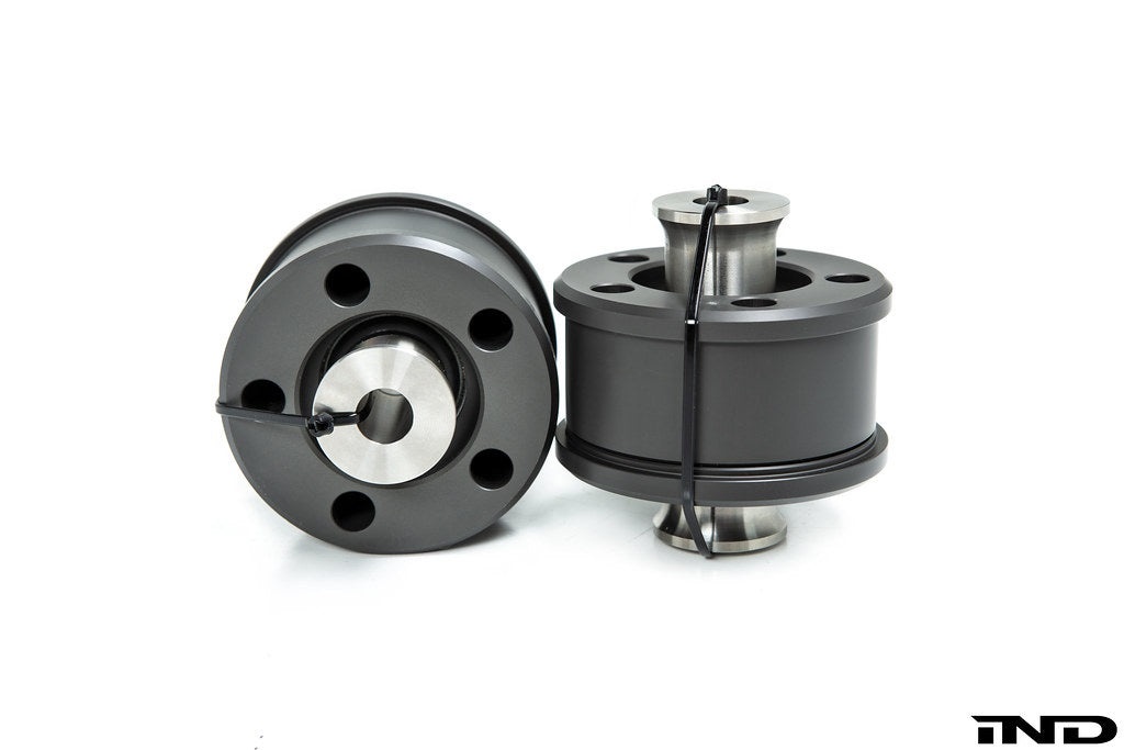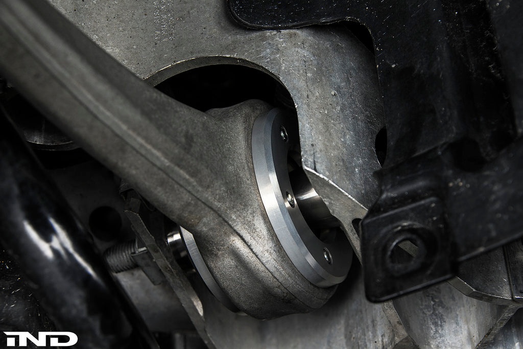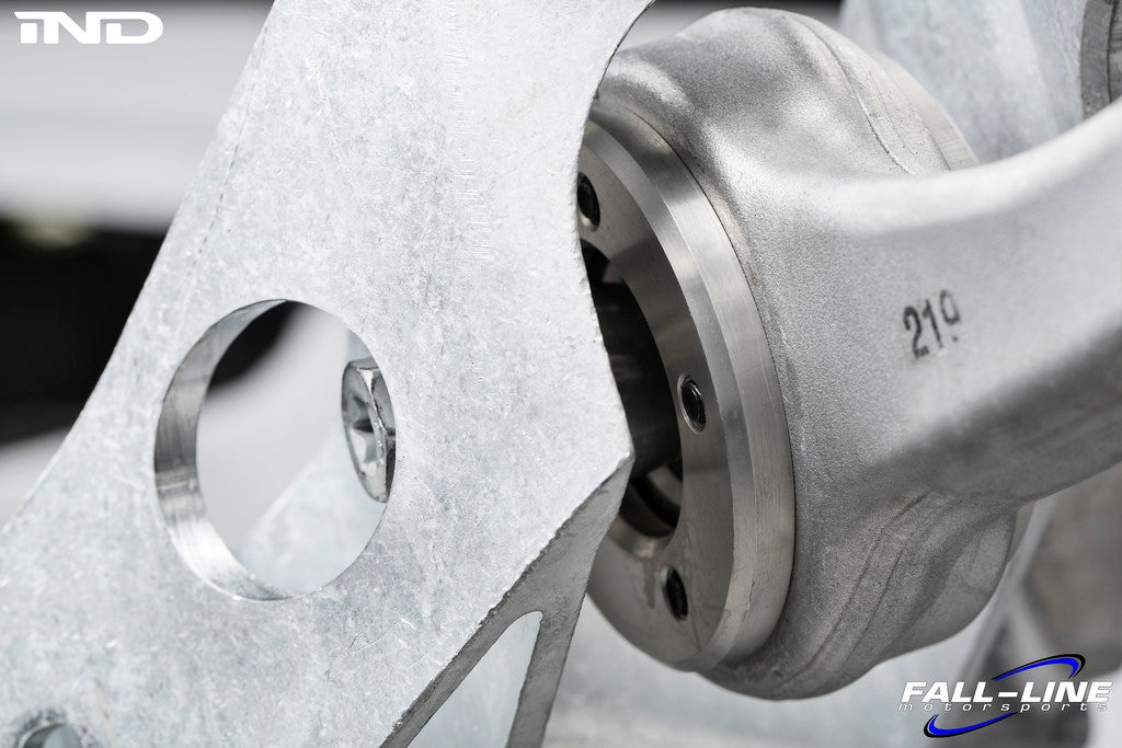 The factory rubber bushing in the M3/4's front suspension is large and prone to substantial deflection under load. This can result in unwanted geometry changes, steering wobble during braking, and even hysteresis of the thrust arm. Fall-Line's solution involves a precision-machined aluminum housing that ensures smooth movement of the thrust arm throughout its suspension travel. The result is an immediate enhancement of steering and suspension feel, adding character to your F8x.