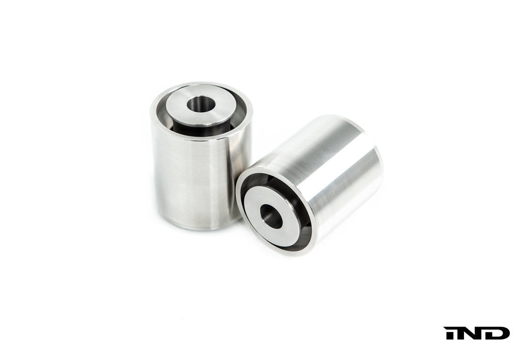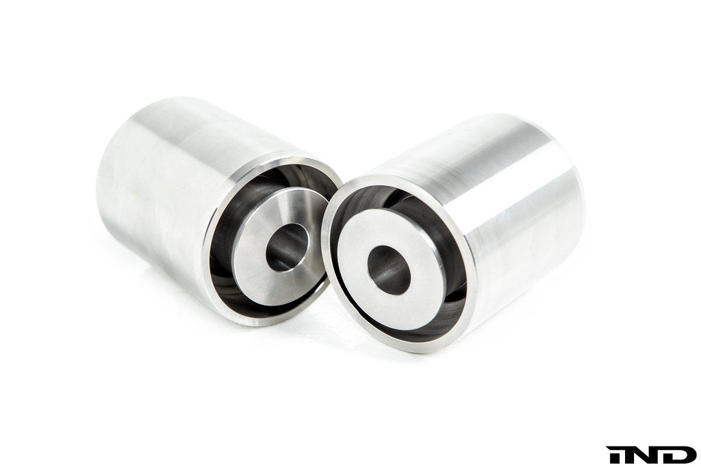 Rubber bushings found in the latest M Cars' rear camber arms are the last weak link in an otherwise rigid suspension. Fall-Line's new lower control arm subframe cup bearings yield a significant improvement over the factory bushings; as motorsport parts, both strength and longevity were priorities—to do just that, Fall-Line boasts the largest FK spherical bearings on the market—by eliminating rubber from a critical feedback area of the car, you gain control over the tire’s behavior and thereby confidence behind the wheel at the limit. To adequately cope with competition-level load, Fall-Line bearings feature stainless steel spiral locks that offer 360 degrees of clamping force to secure the bearing from any potential movement. Designed to replace the rear control/camber arm inner subframe bearings (BMW Part Number: 33326770829)