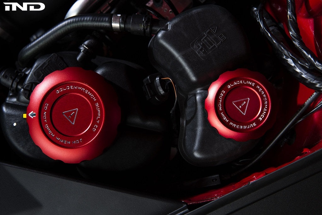 The follow up to Goldenwrench Supply's highly anticipated summer release (Billet Oil Cap Cover) is finally here for preorder with our all new Billet Coolant Cap Cover Set for the A90 Toyota Supra platform! Meticulously designed and created in house to the highest precision and quality seen on our other products giving the factory units an all new form factor. We bring to you the newest addition to the Blackline Performance product line for the all new 2020+ Toyota Supra (A90).