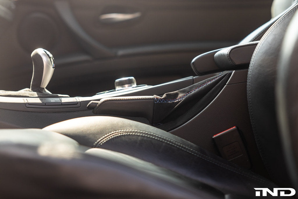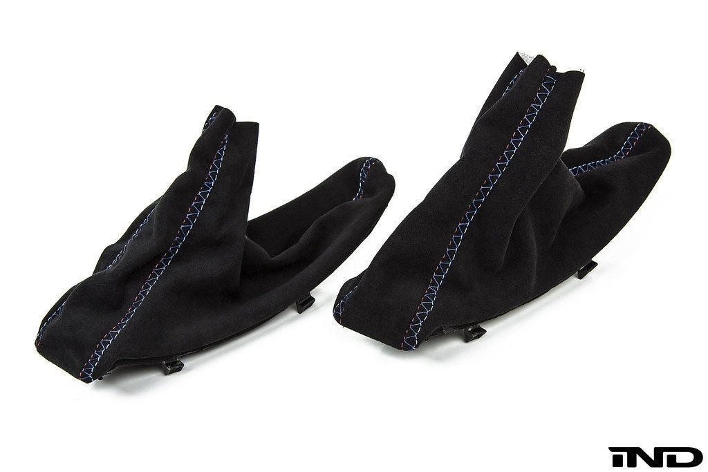 iND now offers its new Tri-Color Collection of leather interior goods with the same attention detail and quality materials you have come to know from their carbon fiber and fabricated parts. Made famous by the first M cars stitched steering wheels, the tri-colors of the BMW M flag can now be added to other panels and surfaces with the same fit and feel as OEM. Each part starts off as a brand new BMW part ensuring the best fitment and materials are at the core of our product. This special version is made with quality Alcantara material to match your BMW performance M steering wheel. Each knob and boot assembly is hand made requiring 5 man hours of work to complete each one!