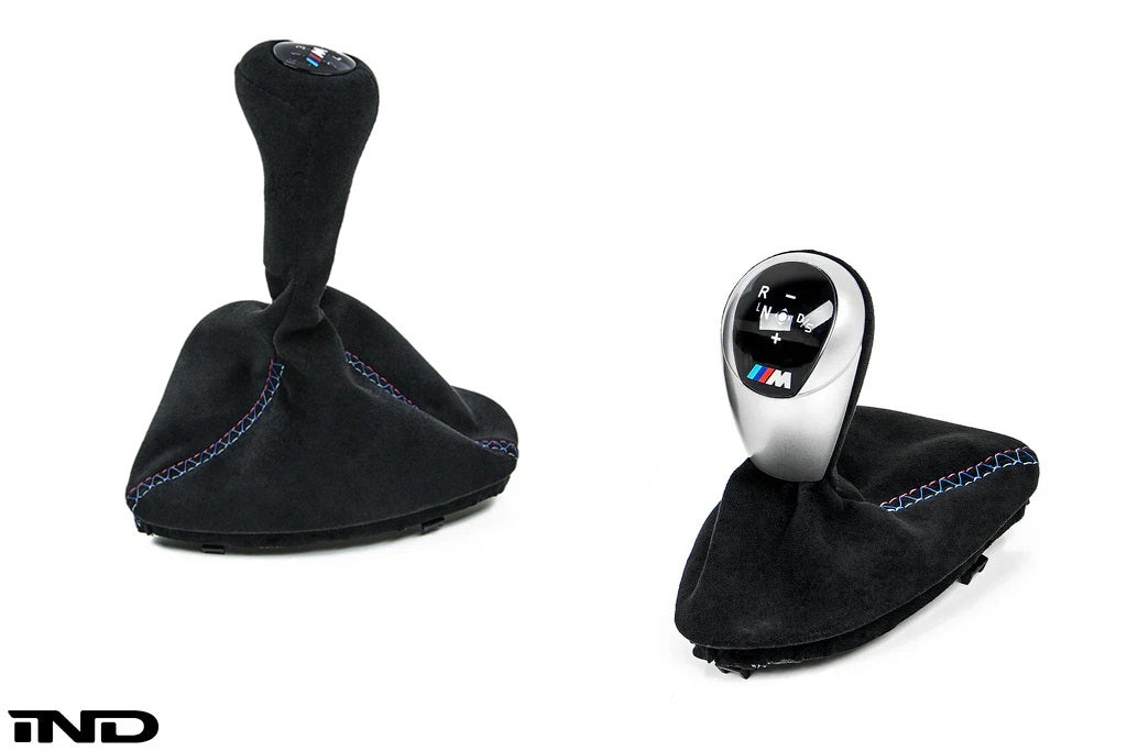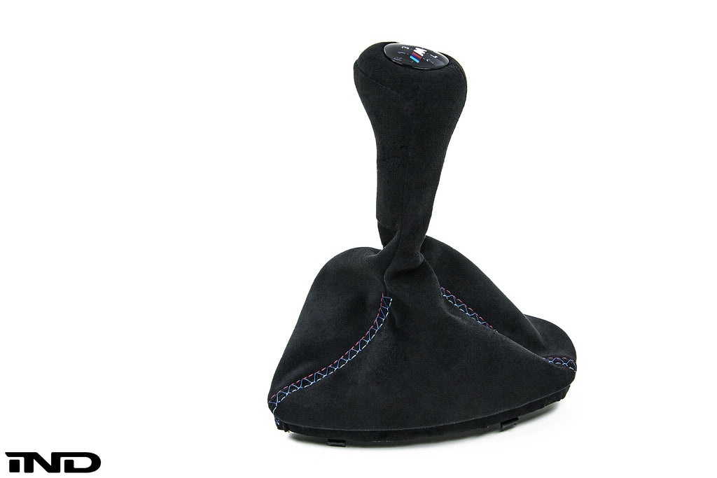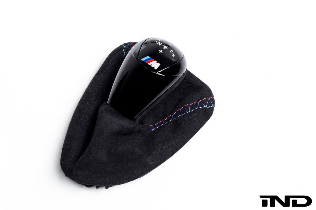 iND now offers its new Tri-Color Collection of leather interior goods with the same attention detail and quality materials you have come to know from their carbon fiber and fabricated parts. Made famous by the first M cars stitched steering wheels, the tri-colors of the BMW M flag can now be added to other panels and surfaces with the same fit and feel as OEM. Each part starts off as a brand new BMW part ensuring the best fitment and materials are at the core of our product. This special version is made with quality Alcantara material to match your BMW performance M steering wheel. Each knob and boot assembly is hand made requiring 5 man hours of work to complete each one!