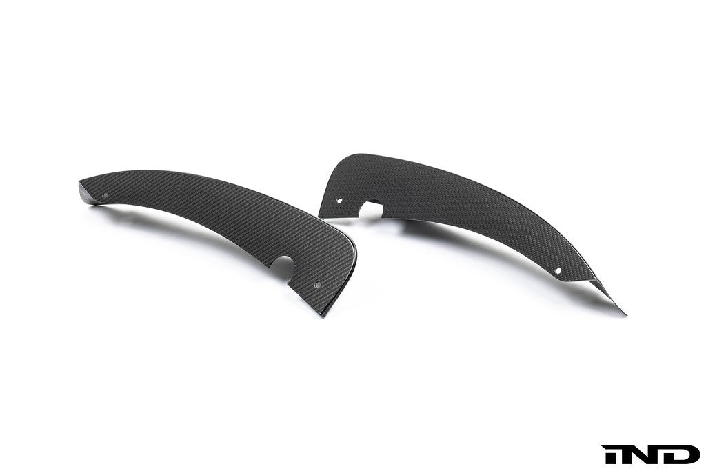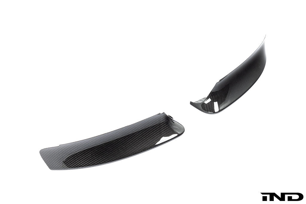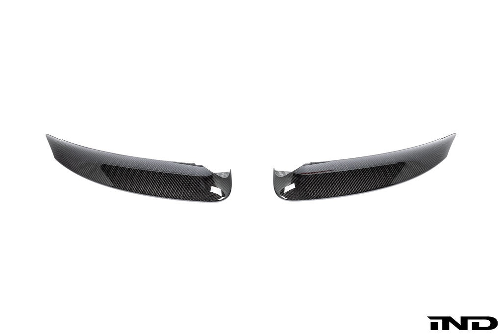 Replacement carbon front splitter set for E46 M3 CSL front bumper. Varnished in high gloss finish with UV protection and constructed in 1x1 plain weave to match the OE CSL front splitters.