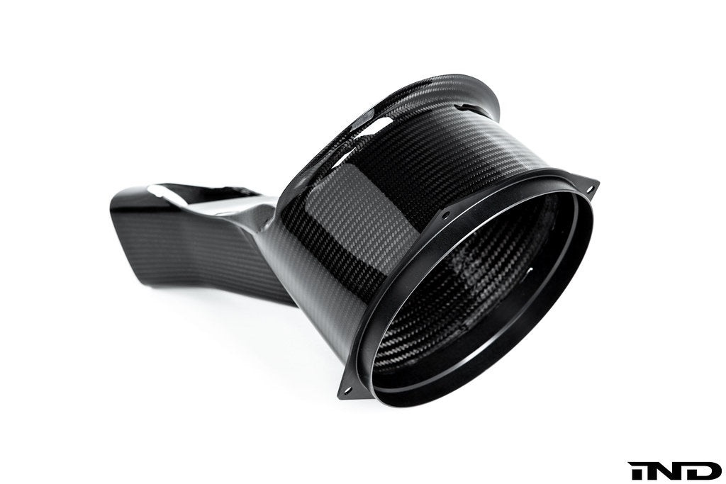 With the installation of the Karbonius Carbon CSL style snorkel, you will reduce your intake air temperatures through the ducting to the front lower factory foglight/CSL bumper intake area; avoiding the hot air inside the engine bay.