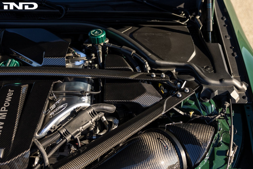 While the F8X M3 and M4 received a huge carbon fiber strut brace that was not only incredibly strong, tying the front strut towers to the front core support, but incredibly beautiful as well. Unfortunately, though it was also an extremely functional piece, working with the space and cost constraints, BMW utilized a stamped steel 2-piece strut brace package for G8X cars.