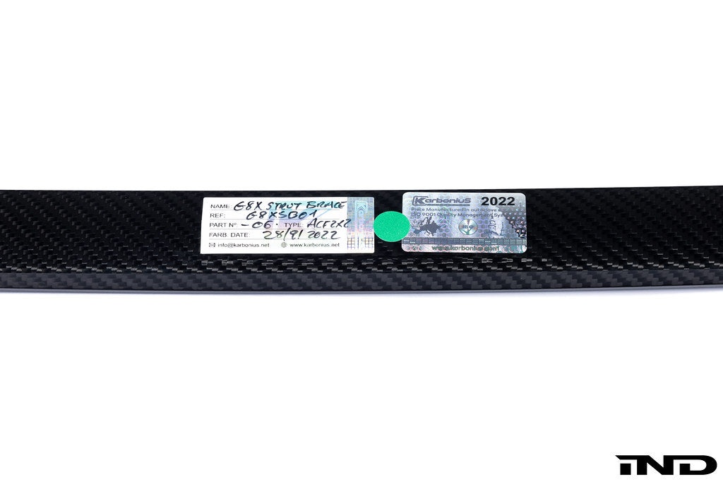 Karbonius has taken it upon themselves to fully redesign the G8x factory front strut brace and replace it with an autoclave cured, 100% Prepreg carbon fiber tubular system, thus reducing the joints and possible weak points. Unlike most other G8x strut braces on the market, the unique 1-piece v-brace doesn't use weaker multi-piece jointed designs or off-the shelf carbon tubes inserted into chassis mounts.