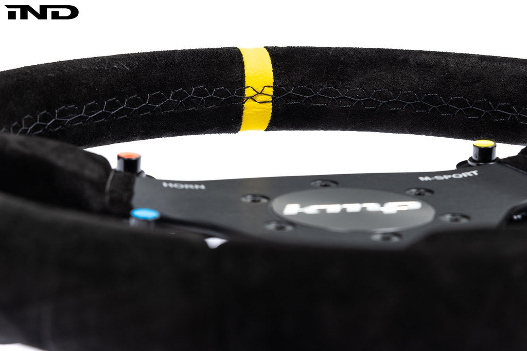 Operation of the KMP wheel echoes OE in paddle placement, but each paddle pull (and button push) comes with a decidedly more mechanical and confidence-inspiring feel. Alcantara wraps the smaller 330mm wheel in its entirety, ensuring optimal grip in all driving situations and quicker response over the stock unit. A yellow motorsport stripe adorns the wheel at 12 o'clock as a perfect finishing touch.