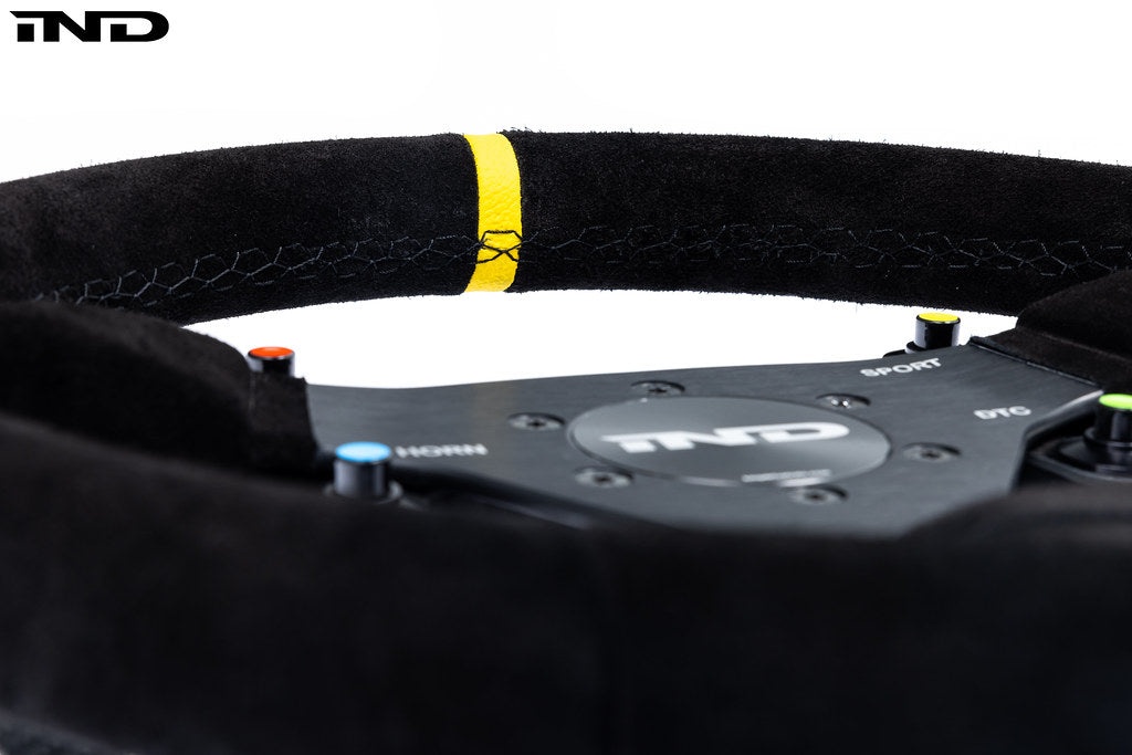 Operation of the KMP wheel echoes OE in paddle placement, but each paddle pull (and button push) comes with a decidedly more mechanical and confidence-inspiring feel. Alcantara wraps the smaller 330mm wheel in its entirety, ensuring optimal grip in all driving situations and quicker response over the stock unit. A yellow motorsport stripe adorns the wheel at 12 o'clock as a perfect finishing touch.