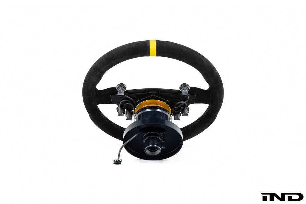 Operation of the KMP wheel echoes OE in paddle placement, but each paddle pull (and button push) comes with a decidedly more mechanical and confidence-inspiring feel. Alcantara wraps the smaller 330mm wheel in its entirety, ensuring optimal grip in all driving situations and quicker response over the stock unit. A yellow motorsport stripe adorns the wheel at 12 o'clock as a perfect finishing touch.