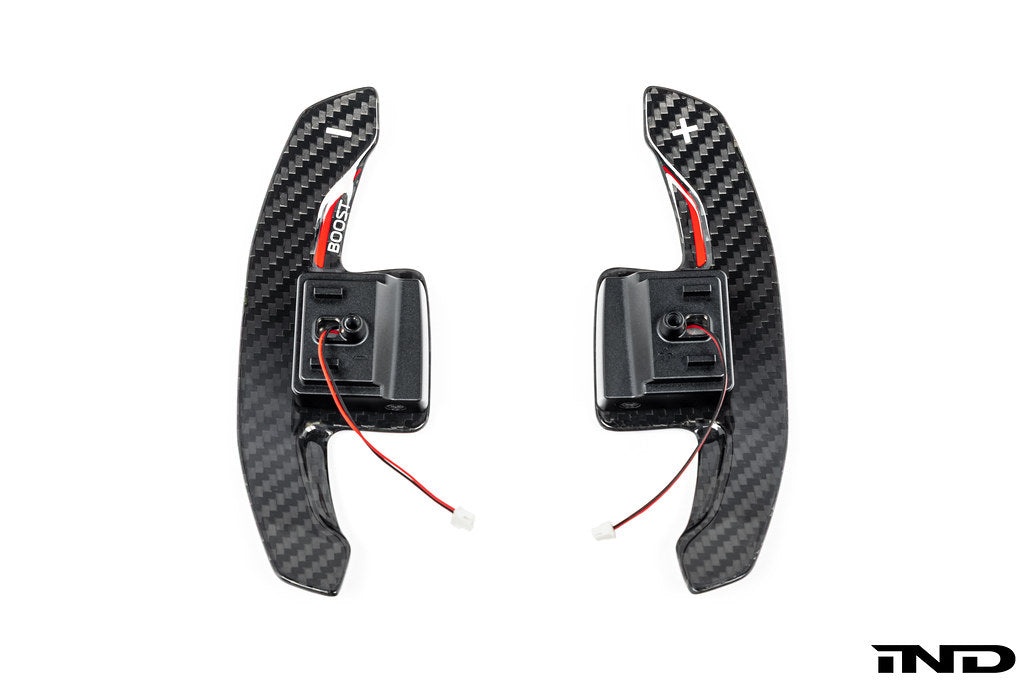 These paddles are crafted from 2x2 gloss twill weave carbon fiber over gunmetal anodized CNC-machined billet aluminum, perfectly matching BMW’s OEM carbon interior trim for a factory-quality appearance. What truly sets this paddle set apart is its OEM-inspired design language—including the distinctive “Boost” font on the minus (downshift) paddle, a direct nod to the factory paddles found in the G9X M5. It's a subtle, refined detail that BMW enthusiasts will instantly recognize and appreciate.