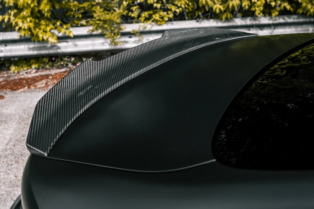 MHC Plus BMW G82 M4 Ducktail Spoiler in Pre-Preg Carbon fibre. Made from the highest quality Pre Preg carbon fibre. This spoiler adds a very aggressive look. It's designed for a direct fit that covers the entire edge of your rear boot.