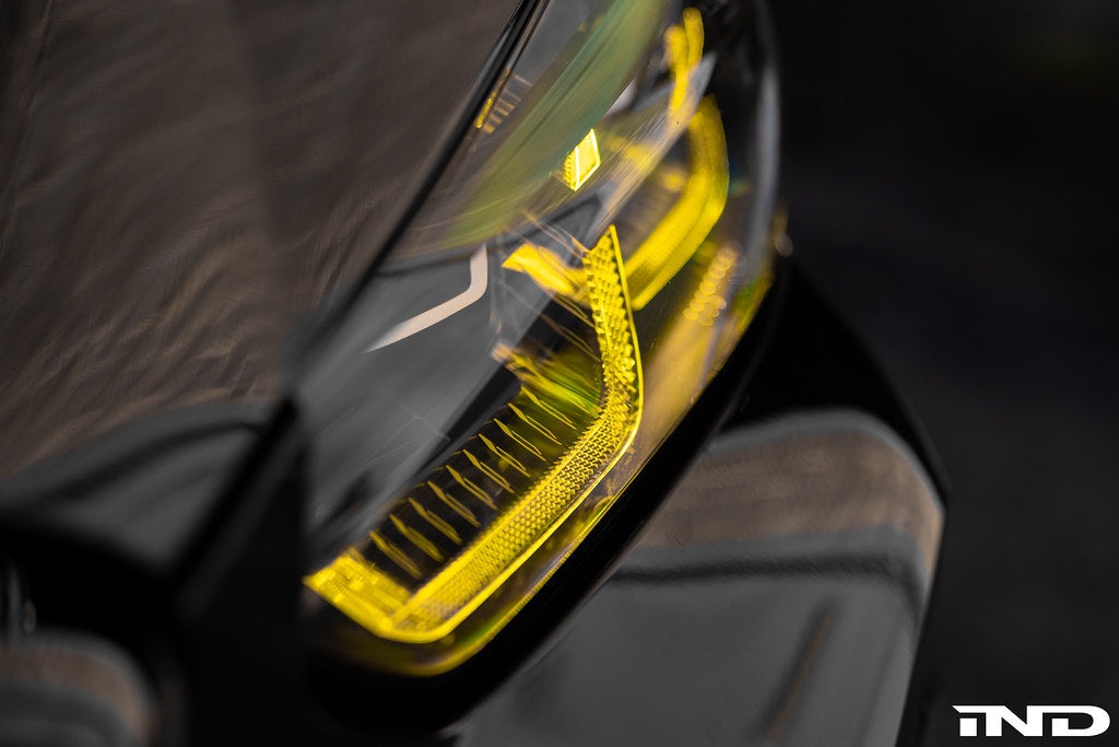 One of the special details of the new BMW M4 CSL are the motorsport yellow daytime running lights. Evoking the look of GT racing cars, the BMW Laserlight headlights with yellow running lights bring a touch of the racetrack to the front of the new BMW M4 CSL. Both in the welcome sequence triggered when unlocking the doors and when the low and high beam headlights are switched on, the angular daytime running lights illuminate in yellow rather than white.
