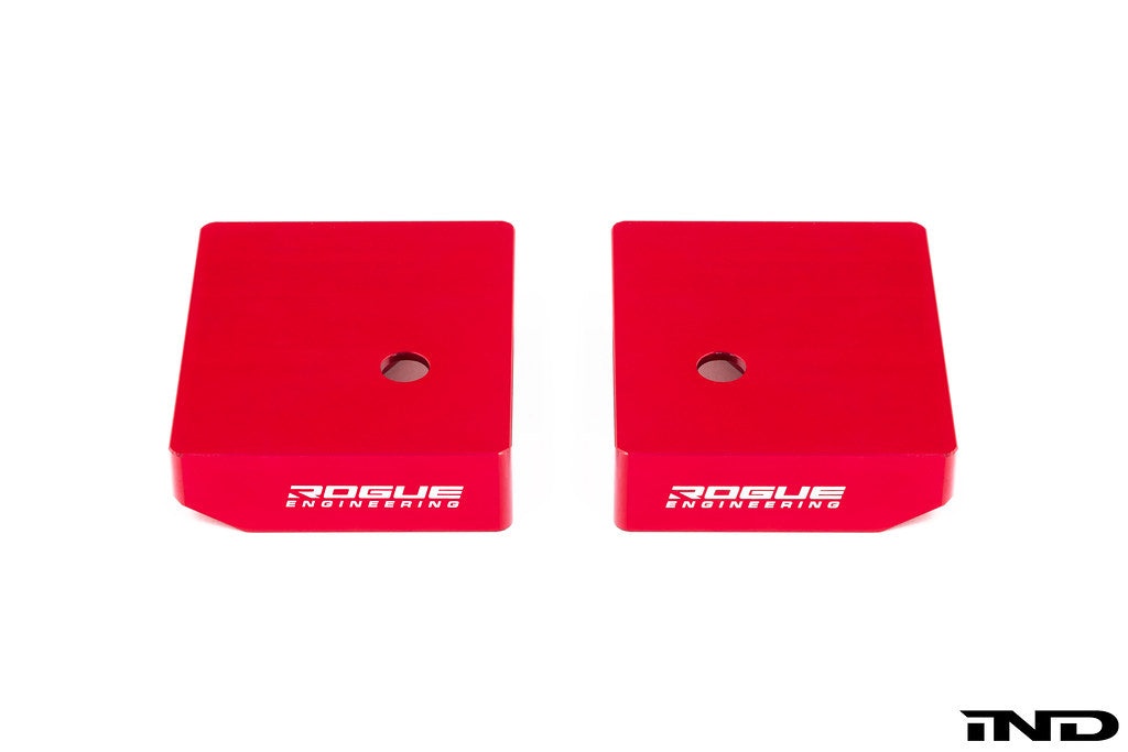 For E46 M3 owners, we have come up with a simple, durable, solution for the rear of the car. Our specially designed lifting blocks between a stronger, alternative chassis point and the factory V-brace attachment. Instead of a plastic pad, these blocks are CNC’d from 6061 aluminum and anodized for durability. Instead of being installed in the weak, vulnerable spot on the chassis that is easily damaged, we now take advantage of a point on the lower part of the body that has a boxed support.