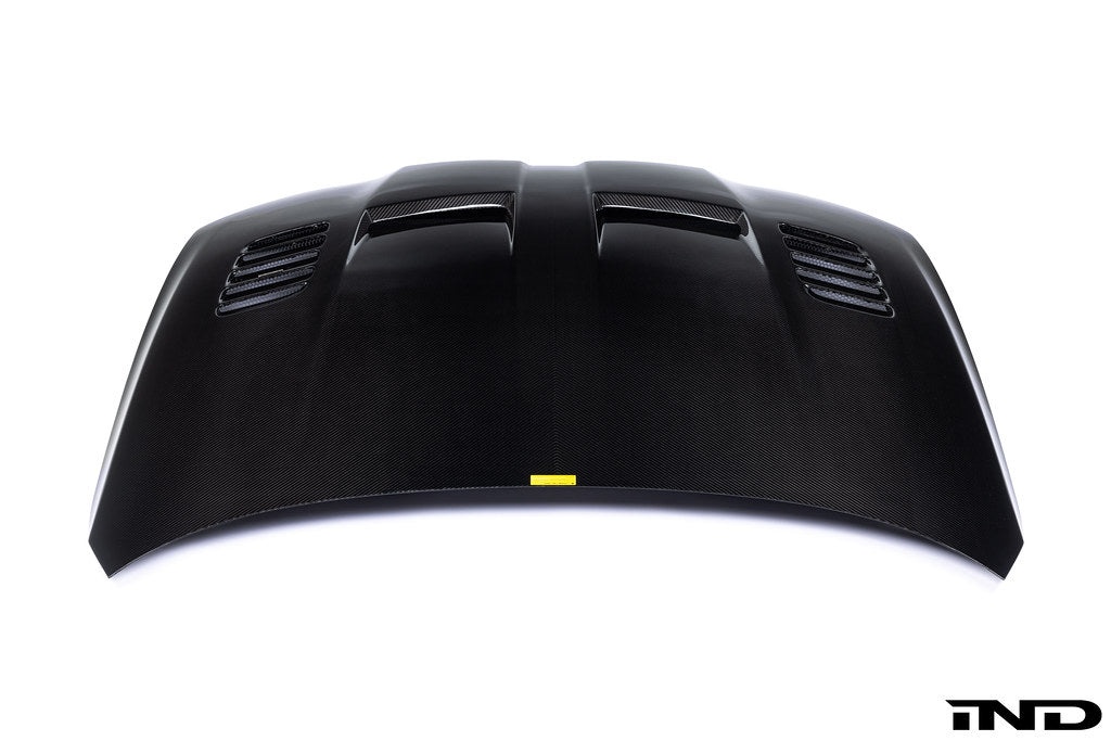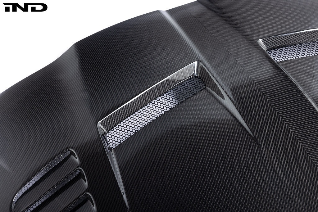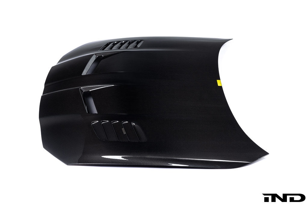 The new Pre-Preg autoclave double sided Carbon Fiber vented hood contains 4 vent outlets to dissipate heat from the forced induction engine bay and keep the turbos running cool.